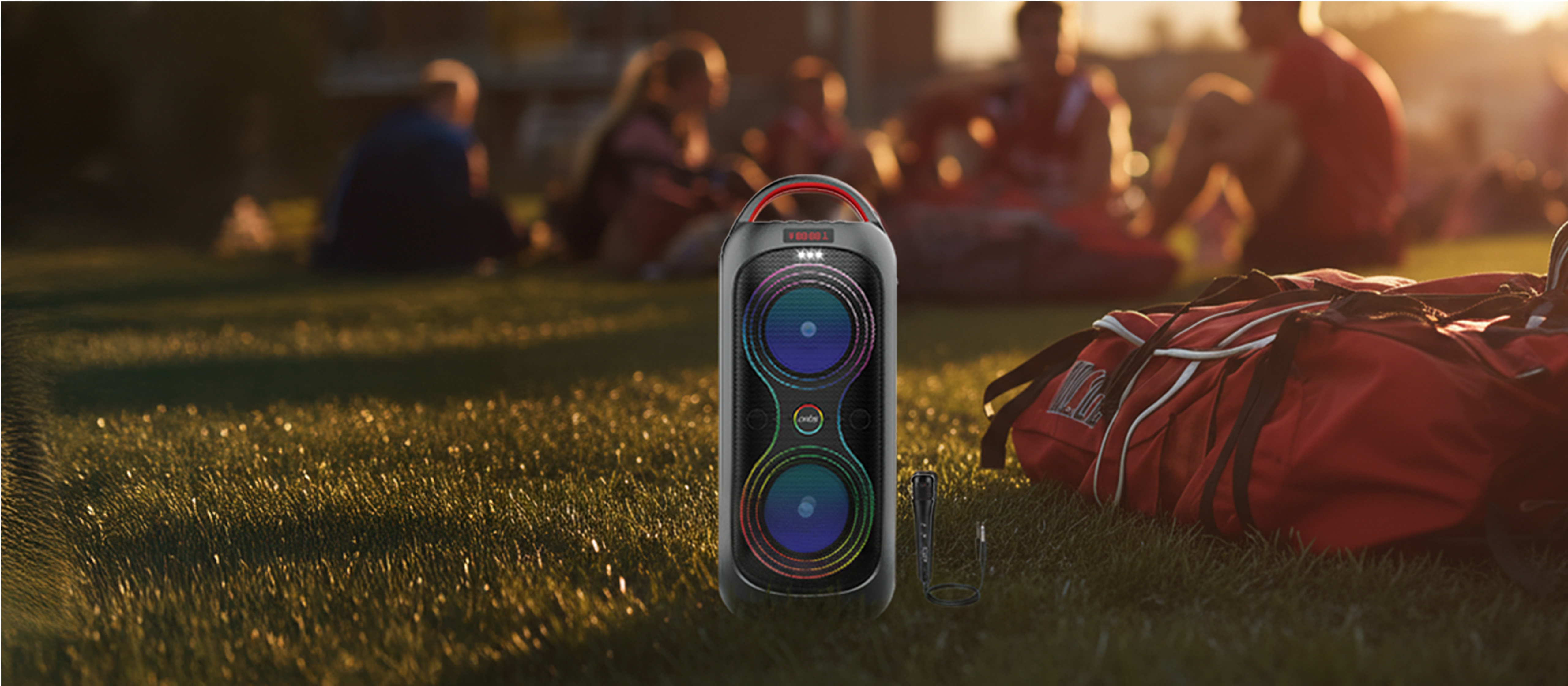 Party speakers are larger and louder, offered with multi-source input modes (Bluetooth, AUX, USB, Mic, Guitar).