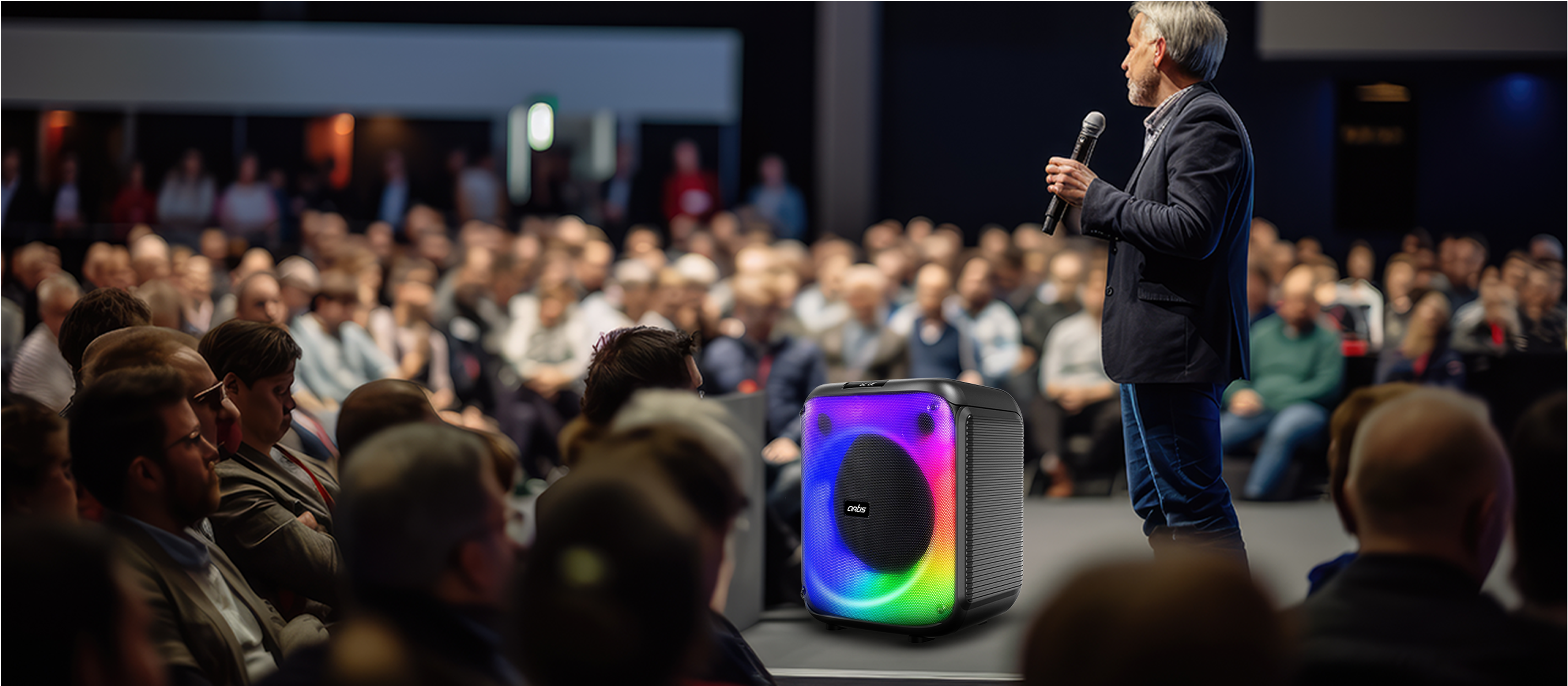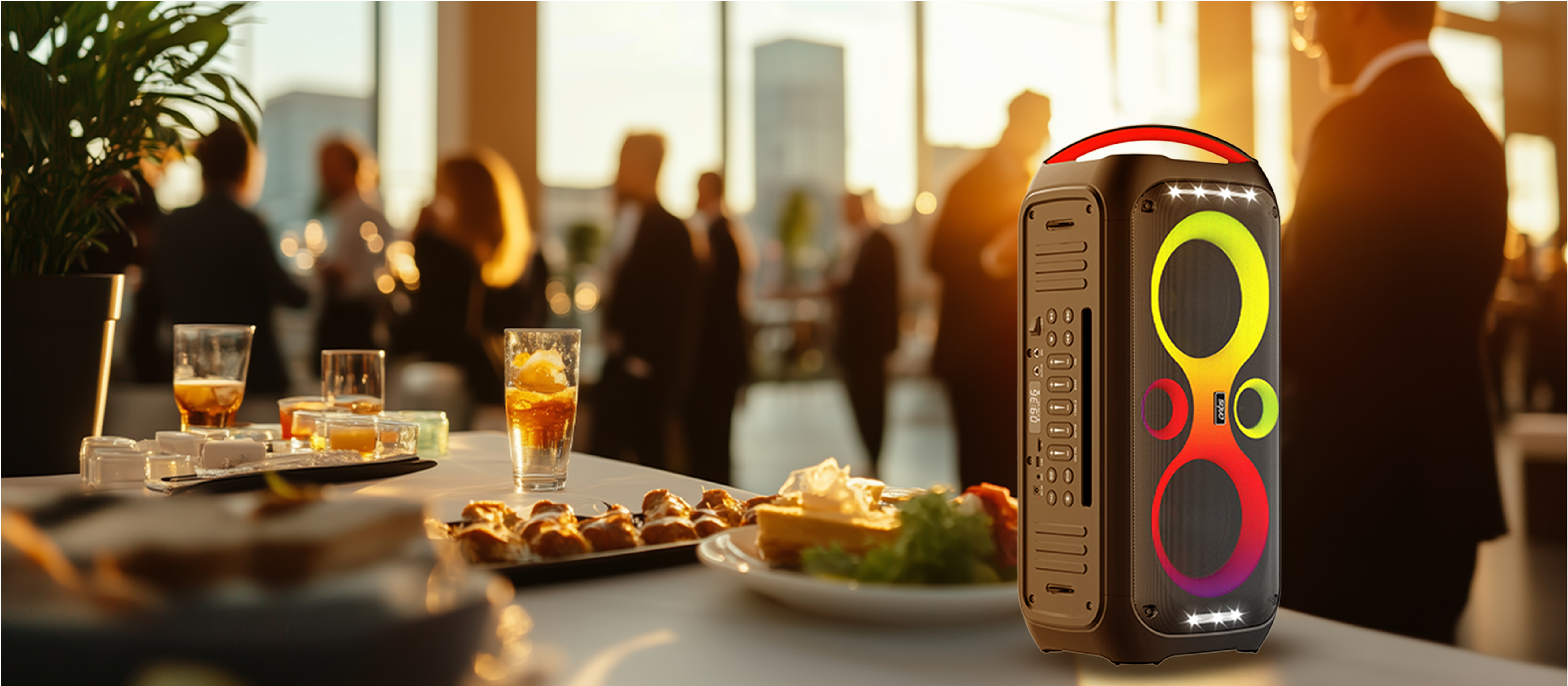 A. Party speaker is a high-powered speaker designed to deliver loud, bass-heavy sound and often includes features like:
